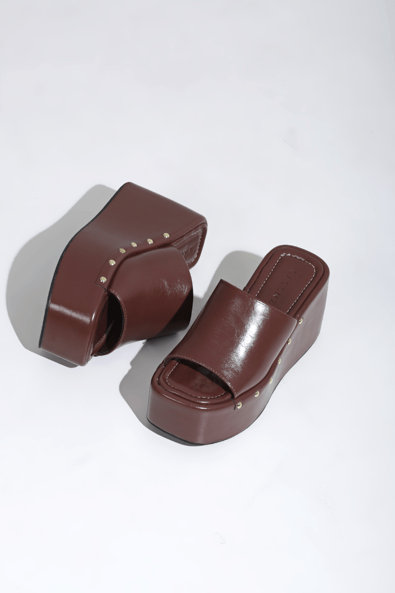 Tamanco feminino anabela cacau com aplicações na lateral.
